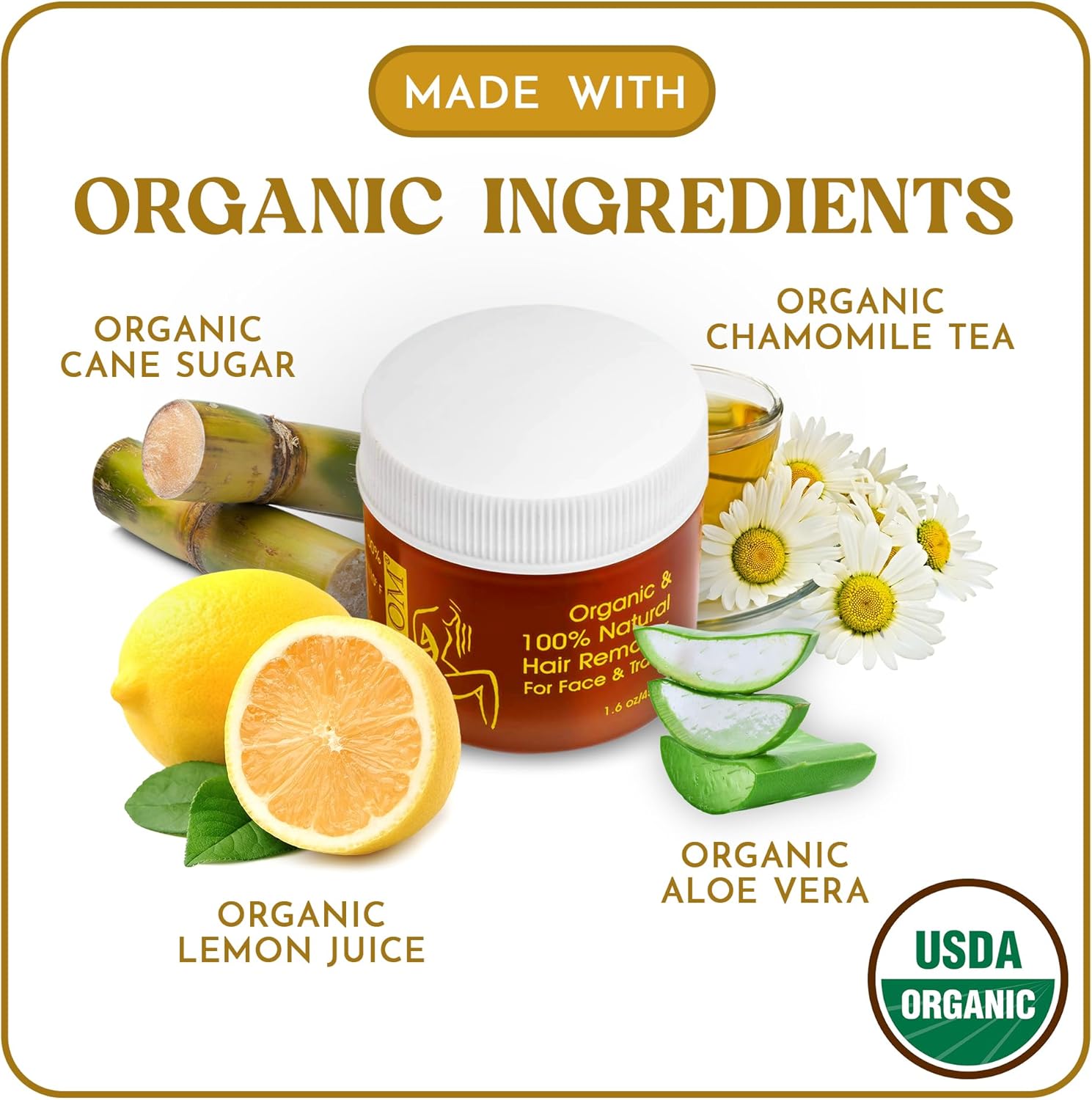 MOOM® Organic Hair Removal Glaze® with organic Aloe Vera pampers your skin with calming chamomile, delicious lemon juice, and Lavender.
